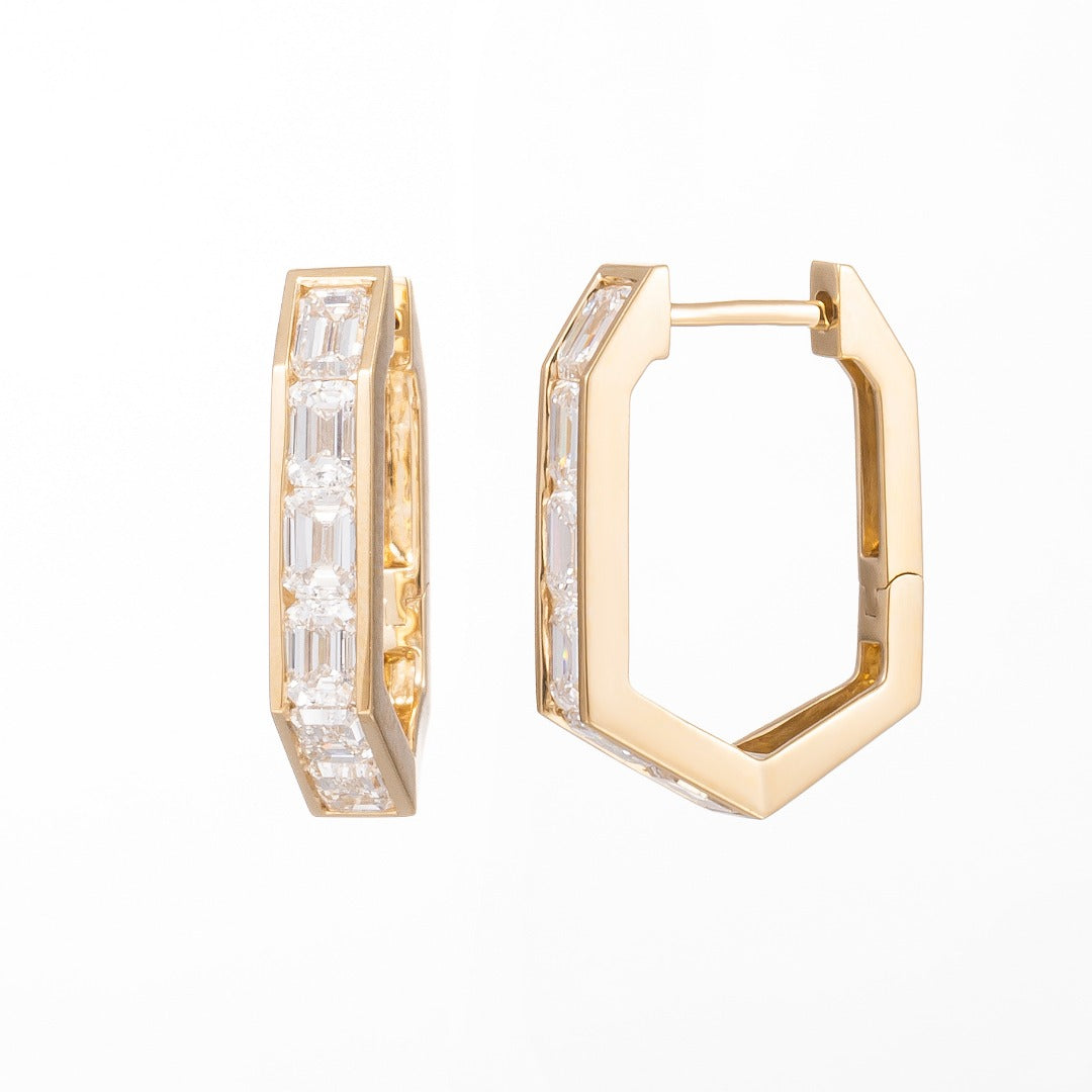 12 顆培育鑽石以精湛工藝鑲嵌於 14K 黃金耳托上,形成華麗的視覺效果。每顆副石都經過嚴格挑選和切割,確保整體光澤均勻一致。總重 1.34 克拉的鑽石讓耳環散發璀璨光芒,1.85 克金重提供穩固的結構,同時保持佩戴的舒適度。無論在日光或燈光下都閃耀動人,展現您的優雅品味。