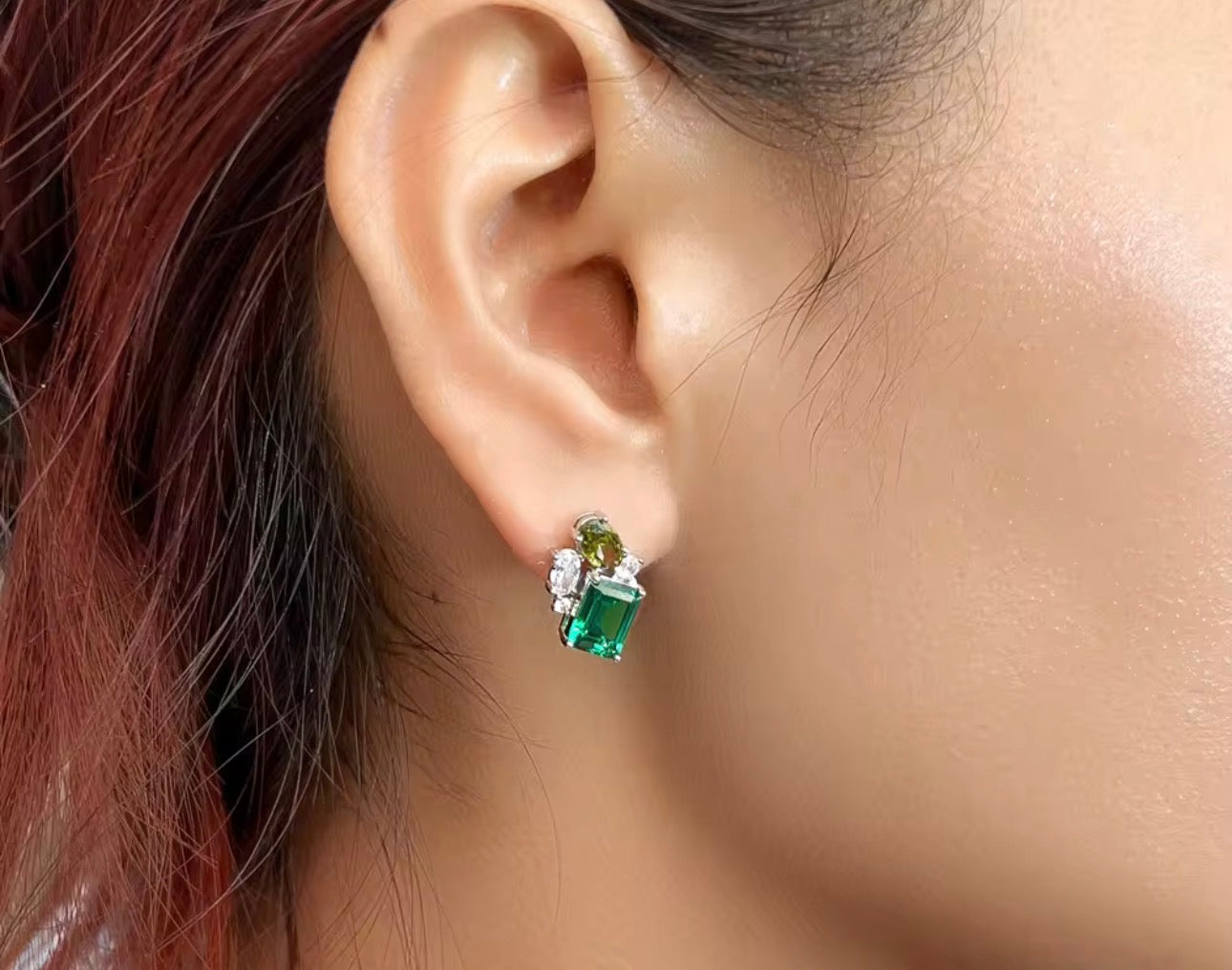 這款精緻的 925 純銀耳環鑲嵌著璀璨的立方氧化鋯人造寶石,呈現迷人的翡翠綠色調。每一顆寶石都經過精心切割,在光線下閃耀著如天然翡翠般的華麗光澤。