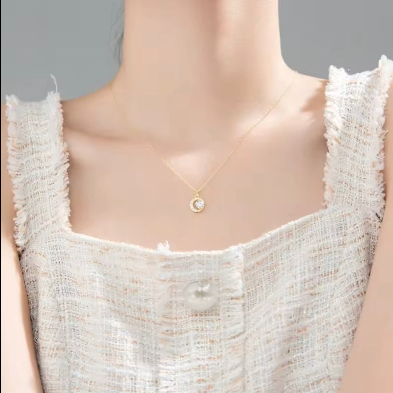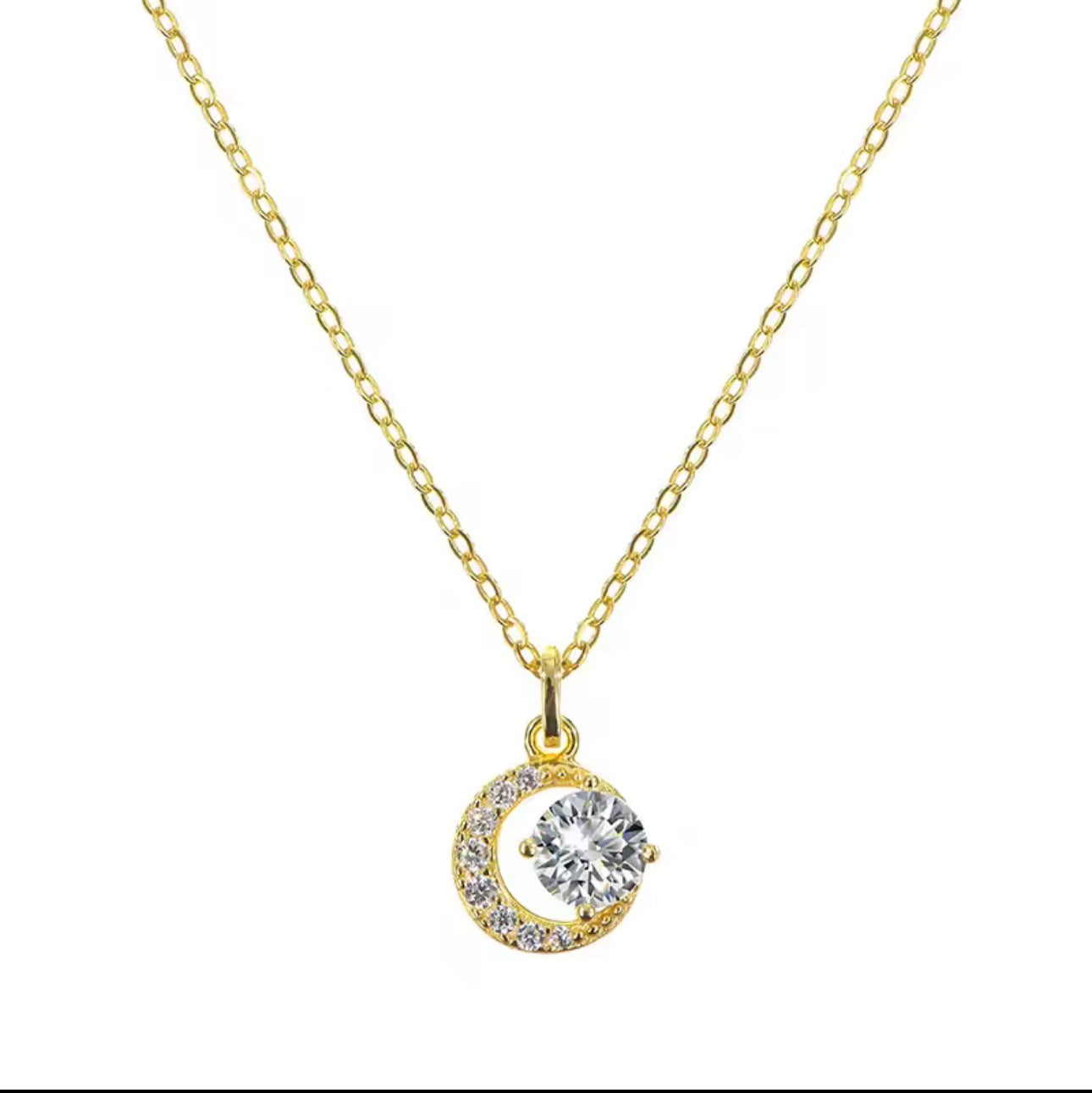 S925純銀14K鍍金鑲鑽迷你日月交替月牙吊墜項鏈